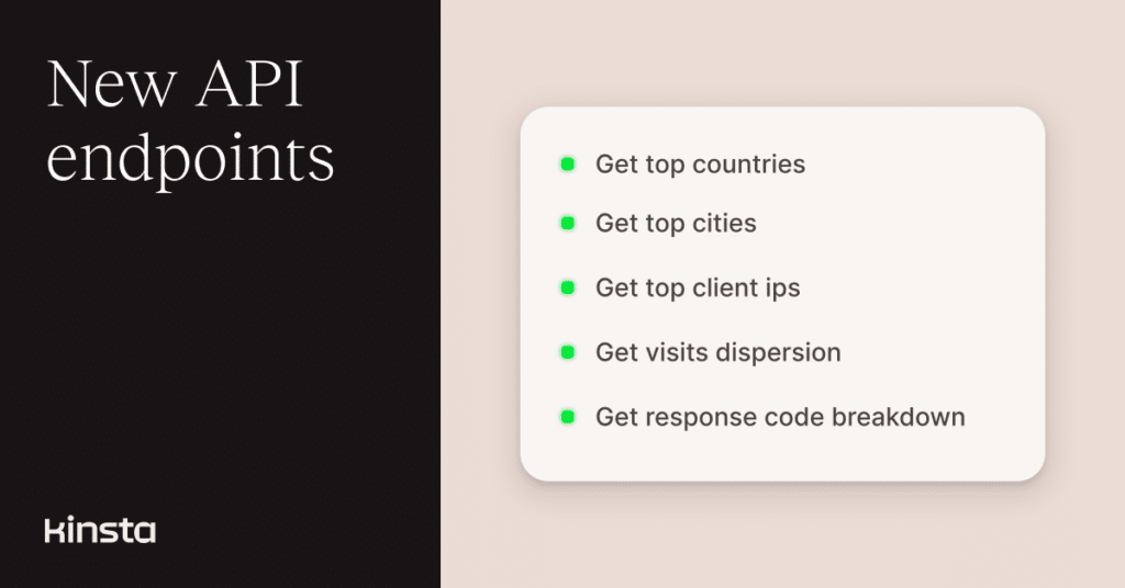 This update adds five new analytics endpoints to the Kinsta API, covering top countries, top cities, top client IPs, visits dispersion, and response code breakdown.