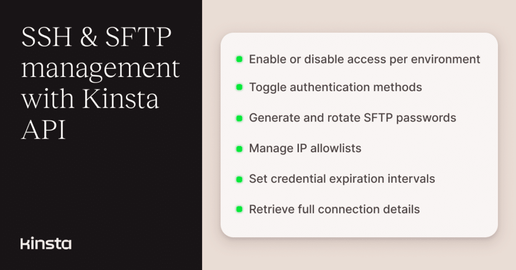 Now, we’re extending those same capabilities to the Kinsta API, expanding on our existing SFTP user management endpoints to give you complete programmatic control over SSH and SFTP access.