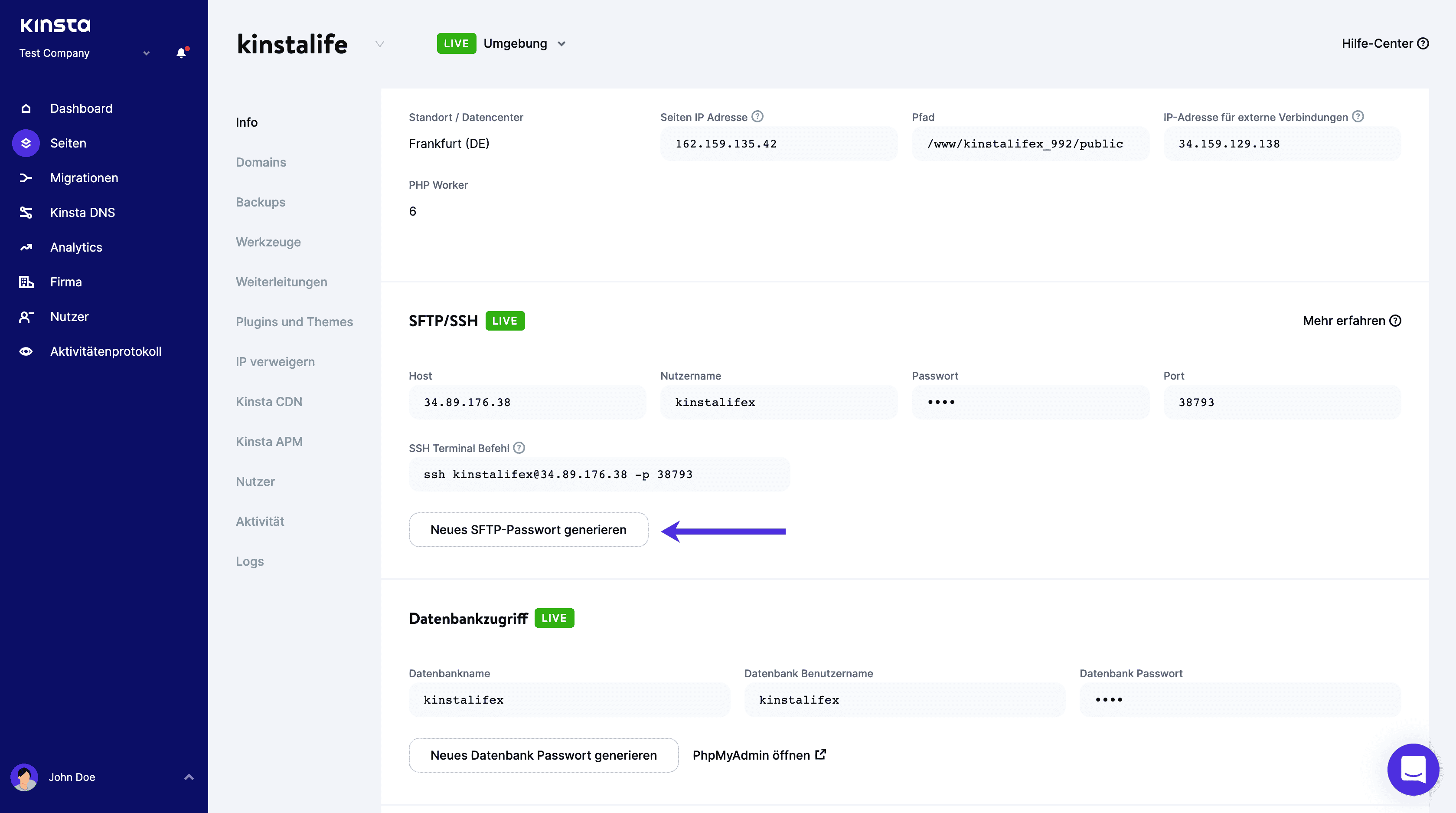 Wenn du das primäre SFTP/SSH-Benutzerkennwort für die aktuelle Umgebung aktualisieren möchtest, fahre mit dem Mauszeiger über das Kennwort und klicke auf Neues SFTP-Kennwort generieren.