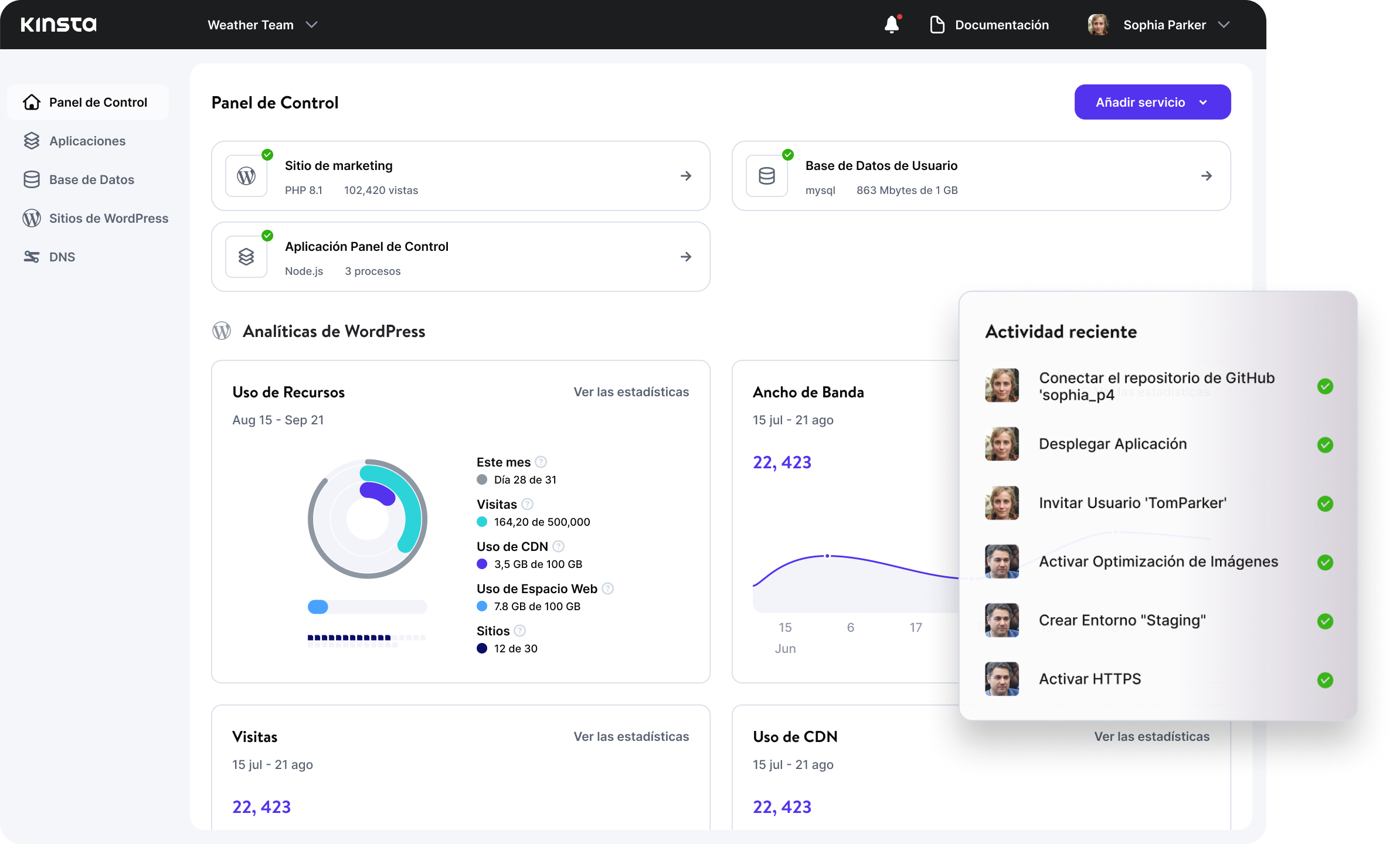 - Análisis y perspectivas detalladas, incluyendo datos de ancho de banda y visitantes, datos de análisis de rendimiento, uso y perspectivas de CDN, y ratio de HIT y MISS de la caché.