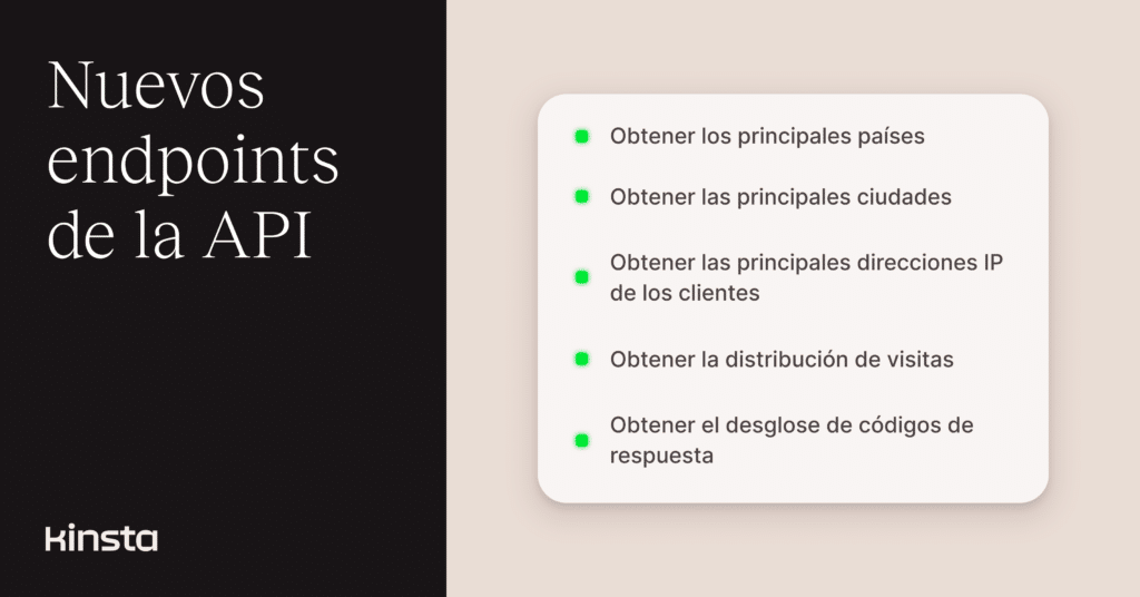 Esta actualización añade cinco nuevos endpoints de analítica a la API de Kinsta, que incluyen los principales países, las principales ciudades, las principales direcciones IP de los clientes, la distribución de las visitas y el desglose de los códigos de respuesta.