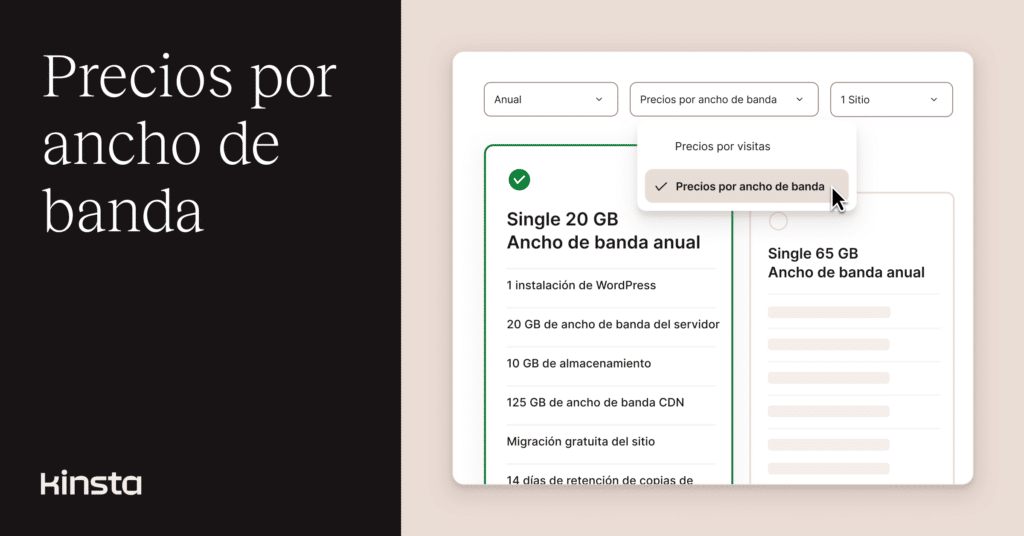 Los clientes de alojamiento para WordPress de Kinsta pueden elegir entre los requisitos de ancho de banda del servidor o el recuento de visitas a la hora de dimensionar nuevos planes de alojamiento.