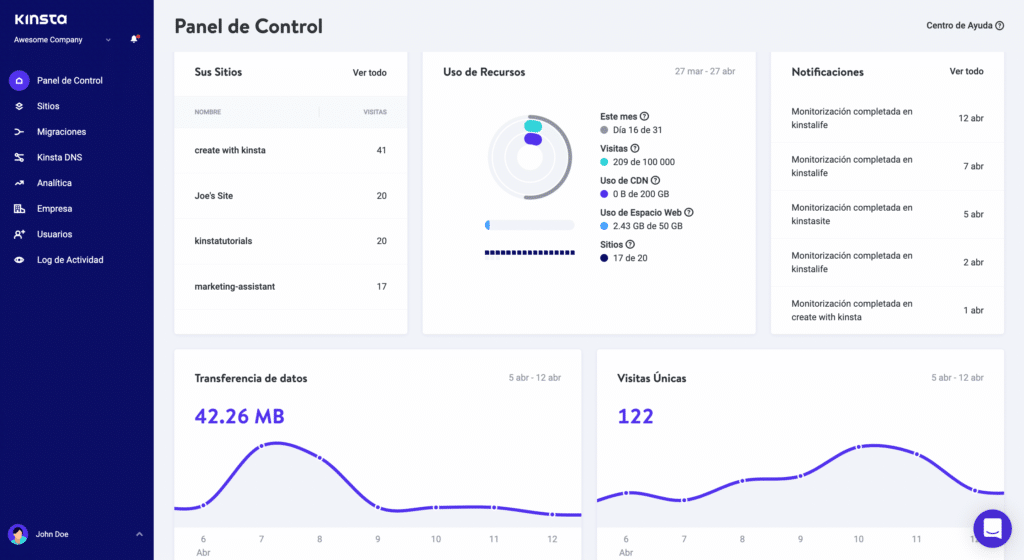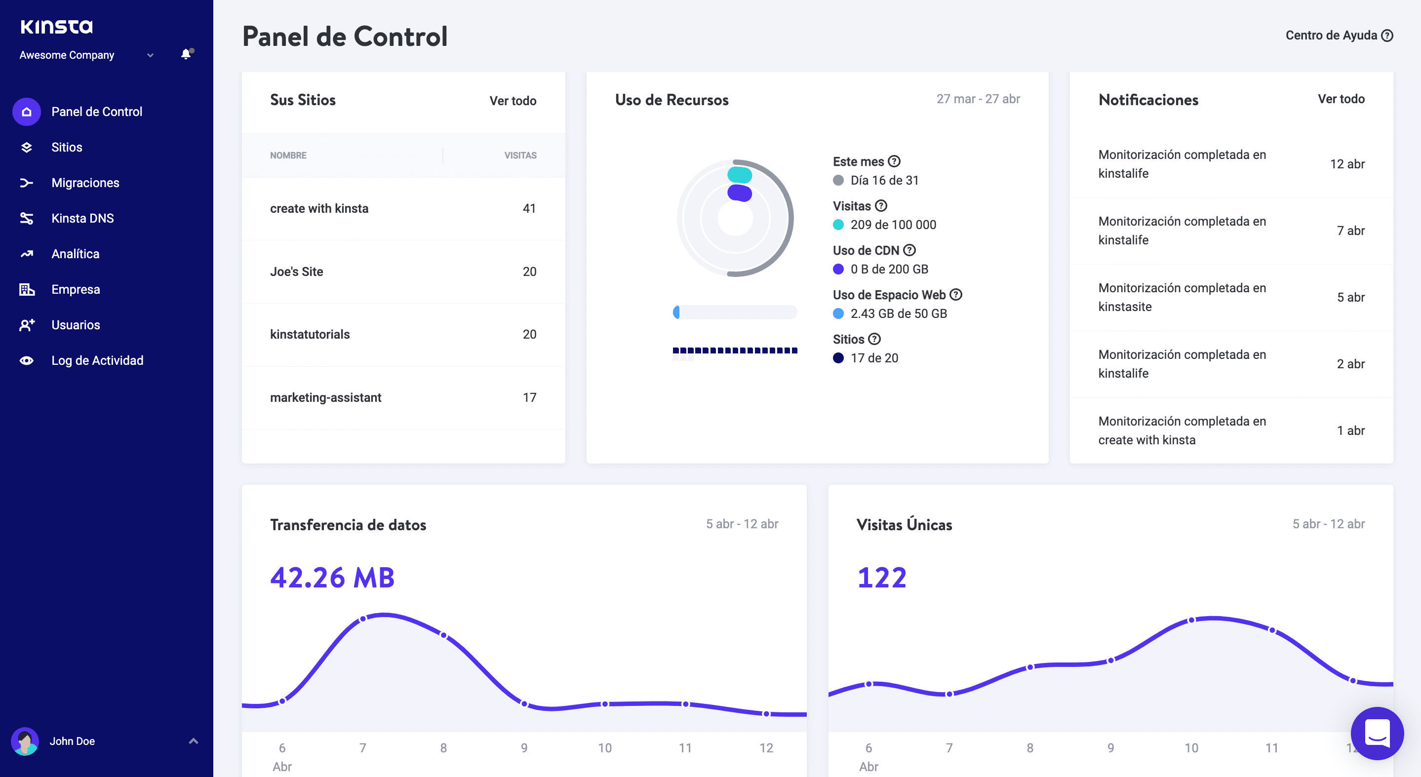 MyKinsta es nuestro panel de gestión del sitio desarrollado a medida. Hace que las tareas de administración del sitio sean fáciles para ti, o para cualquier persona de tu equipo, independientemente de sus conocimientos técnicos. Además, tiene todas las herramientas avanzadas utilizadas por los desarrolladores en un solo lugar. Todo el panel de MyKinsta está disponible en español.