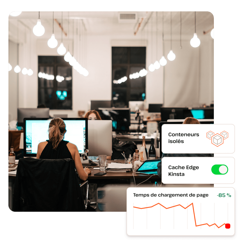 Les clients de Kinsta bénéficient d’un CDN intégré avec 300 emplacements, d’une optimisation automatique de MySQL et d’une amélioration du temps de chargement pouvant atteindre 33 % selon les agences, après être passés de GoDaddy à Kinsta.