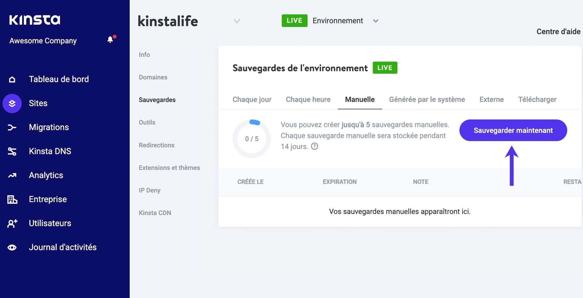 La plupart des hébergeurs vous permettent de générer et de télécharger une sauvegarde complète de votre site et de votre base de données à partir de votre panneau de contrôle. Vous devrez peut-être lire les instructions de votre hébergeur sur la façon d’y parvenir. Chez Kinsta, vous pouvez créer une sauvegarde manuelle ou même télécharger une sauvegarde complète du site Web (.zip).