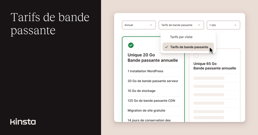 Désormais, vous pouvez facilement basculer entre la tarification basée sur les visites et la tarification basée sur la bande passante pour votre plan d’hébergement dans MyKinsta.