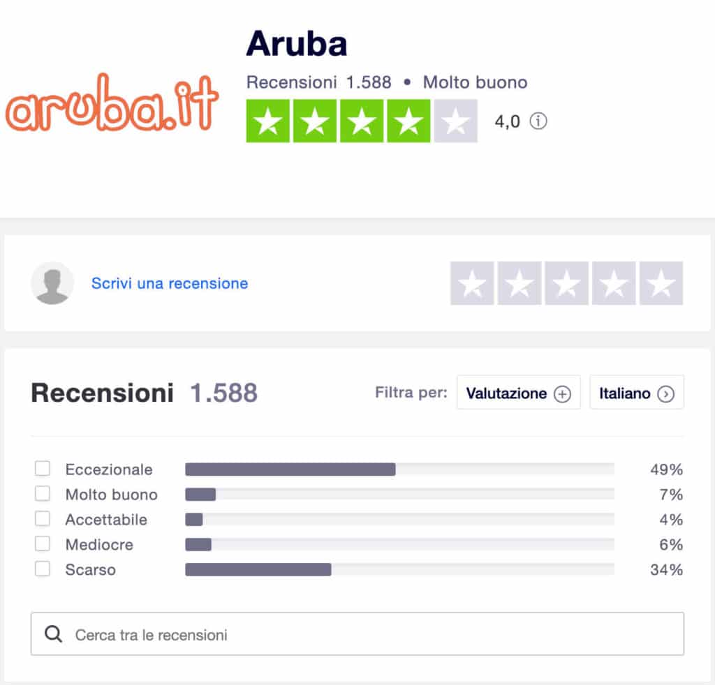 Su Trustpilot Aruba conta oltre 1500 recensioni, ma con un altissimo 34% di clienti assolutamente insoddisfatti e con solo un 49% di clienti che assegnano ad Aruba il massimo dei voti.