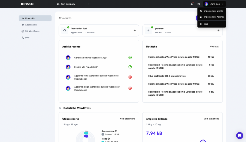- La dashboard di MyKinsta è fatta su misura per il tuo account e permette di accedere praticamente a tutte le funzioni necessarie per gestire e monitorare la tua rete.