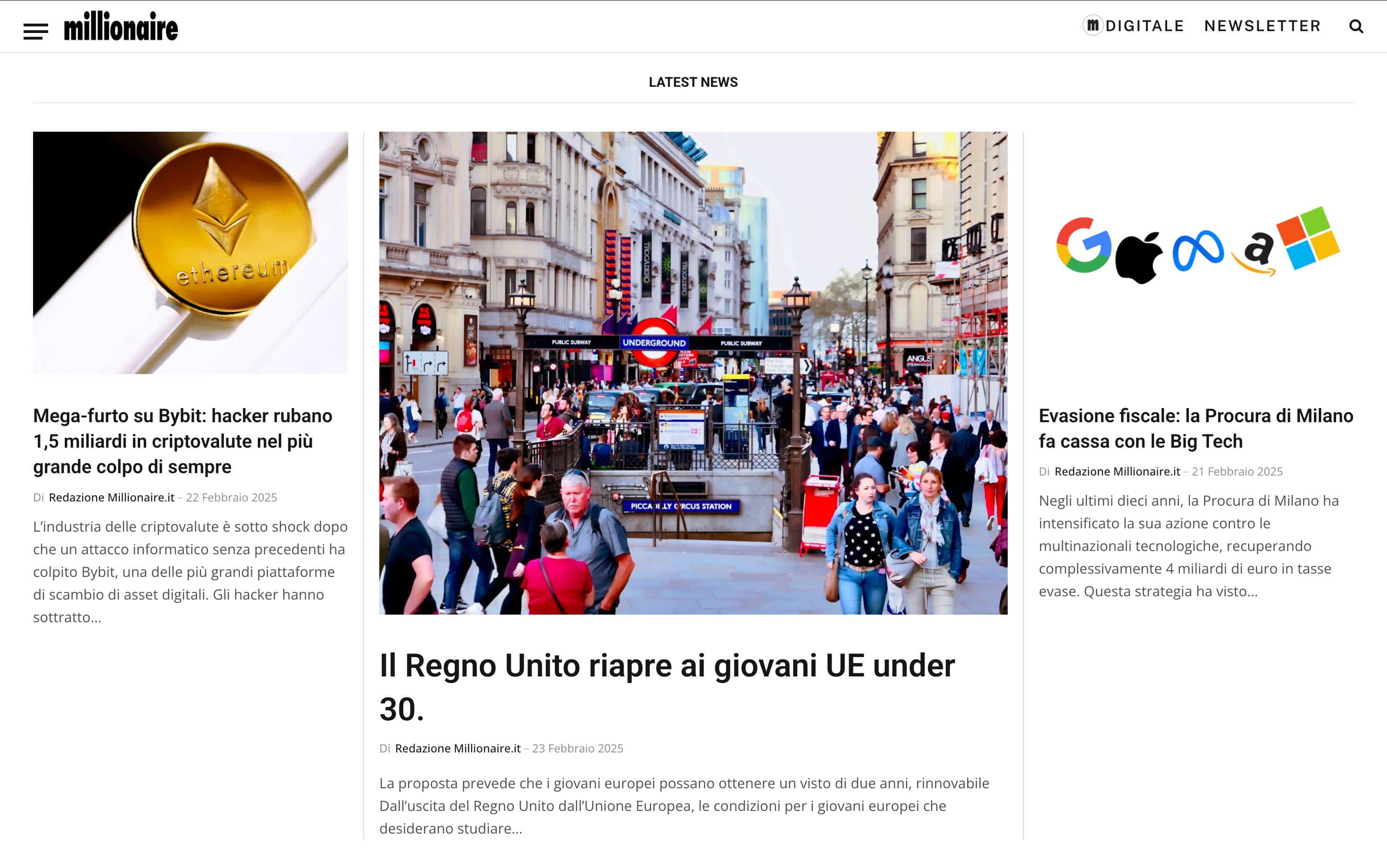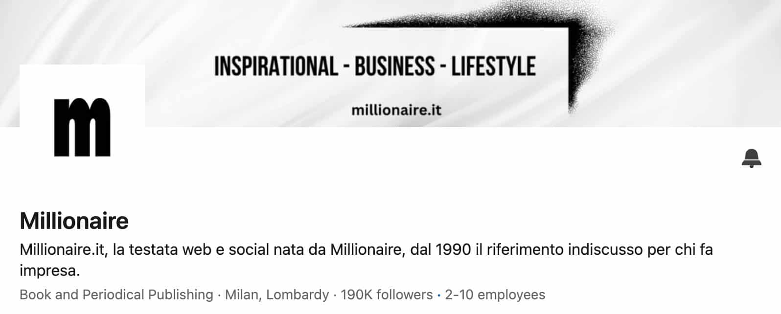 Millionaire Magazine è un business magazine storico italiano nato nel 1990. Nel corso degli anni è stato sempre sinonimo di stampa ispirazionale per chi voleva avviare una propria attività indipendente. Negli ultimi anni, con il grande cambiamento del settore media italiano, il magazine cartaceo ha ridotto la sua diffusione, pur rimanendo un riferimento nel mercato. A partire dal 2022, con la nuova proprietà, la testata si è riorganizzata, avviando l’edizione online come testata quotidiana indipendente di approfondimento sui temi legati al business. In questo lasso di tempo, la presenza online, soprattutto su social come LinkedIn, è triplicata in meno di due anni.