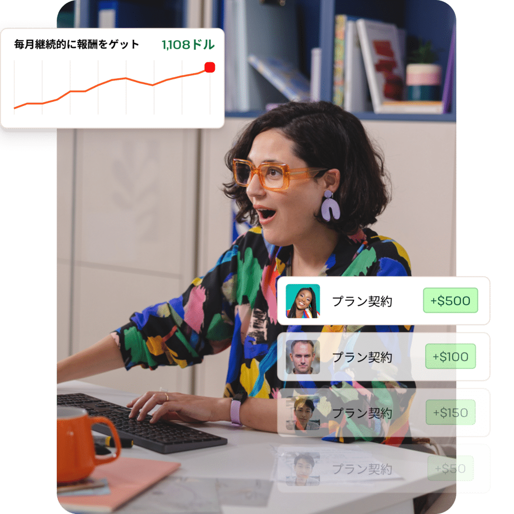 アフィリエイトリンクから誰かがサービスを契約すると、50〜500ドルの初回報酬、そして紹介相手がサービスを利用し続ける限り、毎月10%の報酬を受け取ることができます。