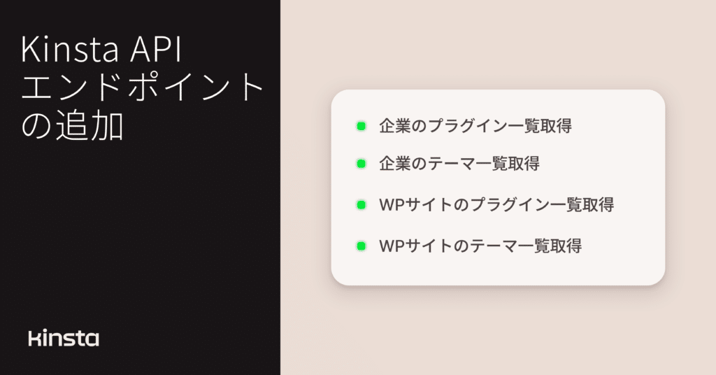 Kinsta APIに新たなエンドポイントが追加されました。企業またはサイト単位で、WordPressのプラグインとテーマ一覧を簡単に取得可能です。