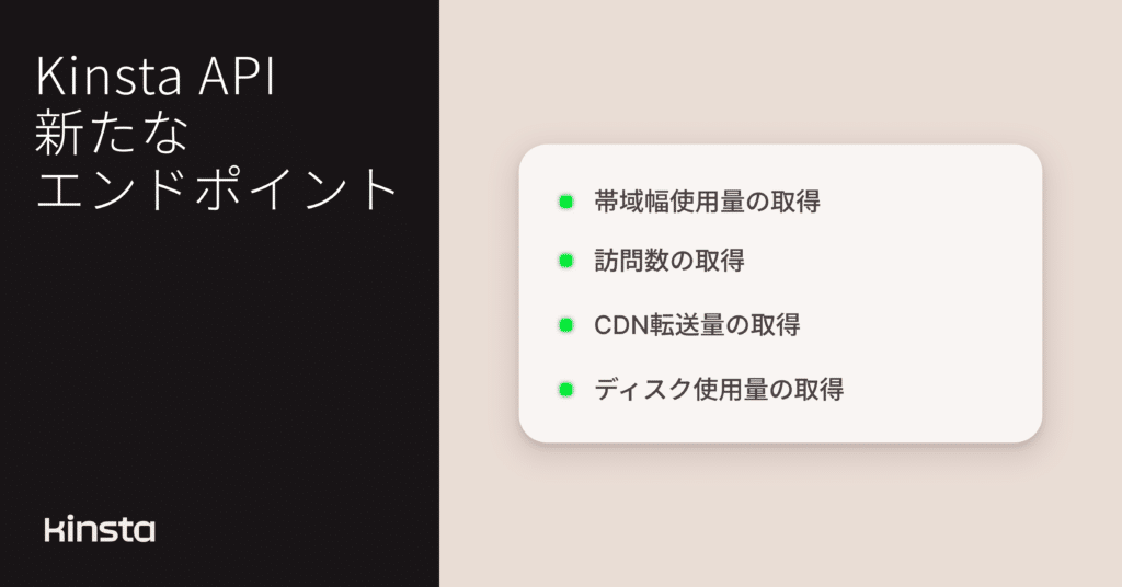 今回導入された分析エンドポイントにより、開発者は自動化やレポート作成のワークフローから、Kinstaでホスティングしている環境の状況をより可視化できるようになりました。