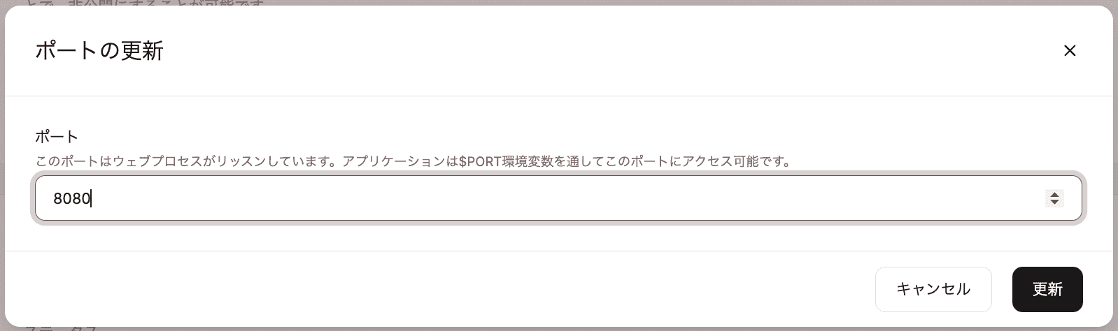 アプリケーションのウェブプロセスのデフォルトポート番号は、8080です。アプリケーションがデプロイされると80番および443番ポートでインターネットにアクセスできるようになり、アプリケーションによって定義されたポートのコンテナにこれらのポートをルーティングします。このポートは、アプリケーションの実行時に$PORT環境変数で利用可能です。別のポートを定義することもできますが、コアシステムが使用する15000、15001、15004、15006、15008、15009、15020、15021、15053、15090を除いて、1~65535の範囲内である必要があります。