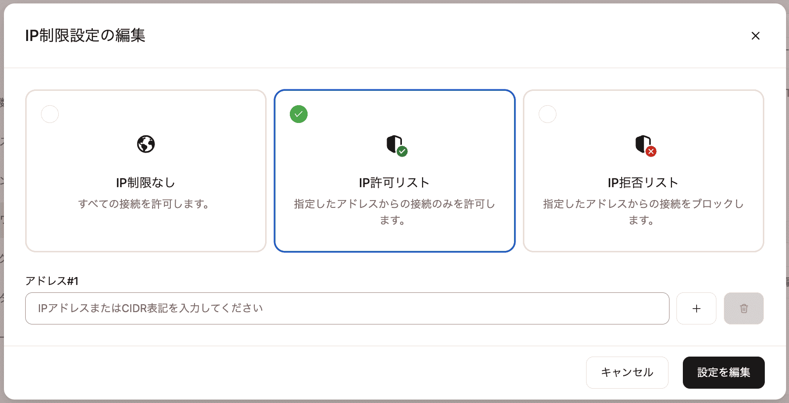 IP制限の設定を変更するには、「設定を編集」をクリックして、以下のいずれかを選択します。