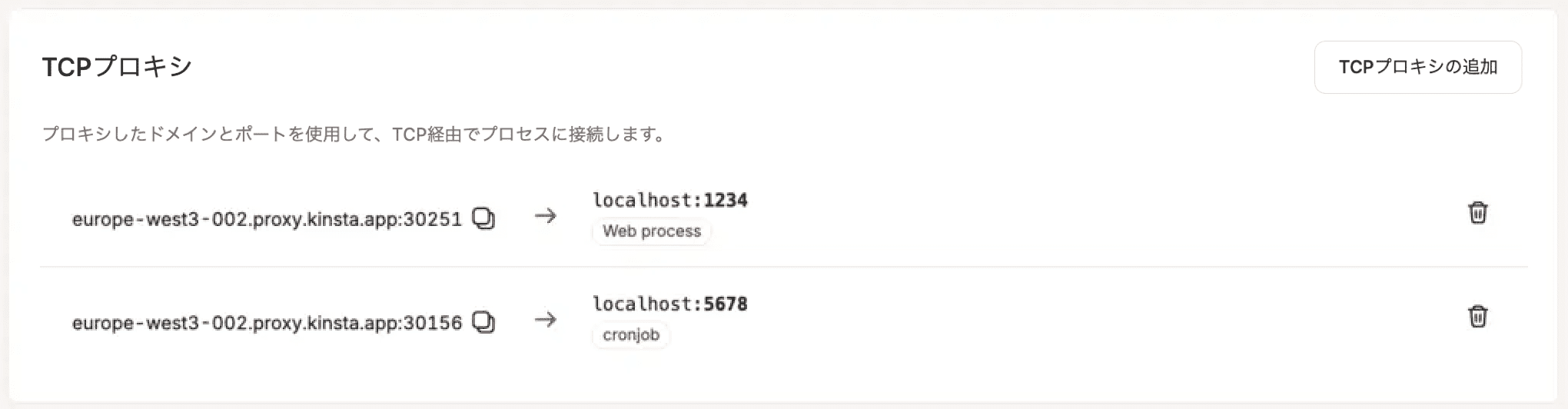 TCPプロキシが追加されると、プロセスにホスト名が割り当てられます。このホスト名を使用して接続が可能になります。