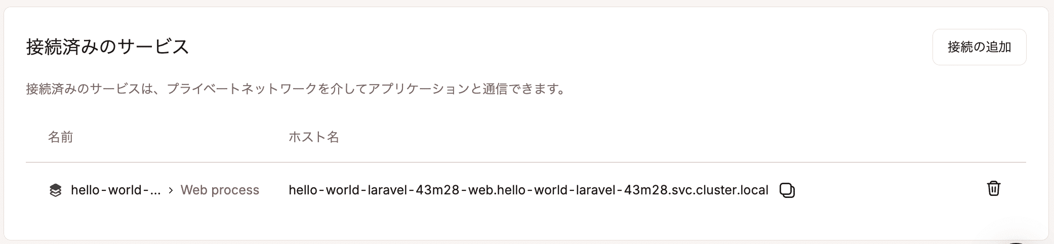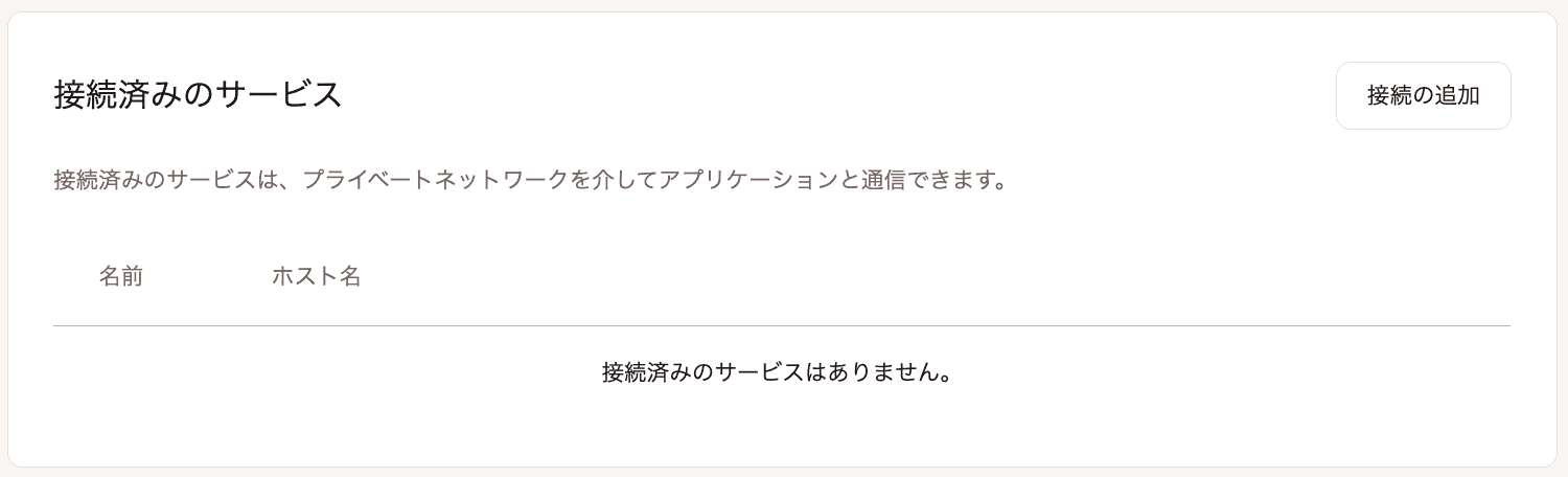 アプリケーションから別のアプリケーションまたはデータベースへの接続を追加するには、「アプリケーション」>(アプリ名)>「ネットワーク」>「接続済みサービス」セクションで「接続を追加」をクリックして、内部接続を作成するアプリケーションまたはデータベースを選択します。