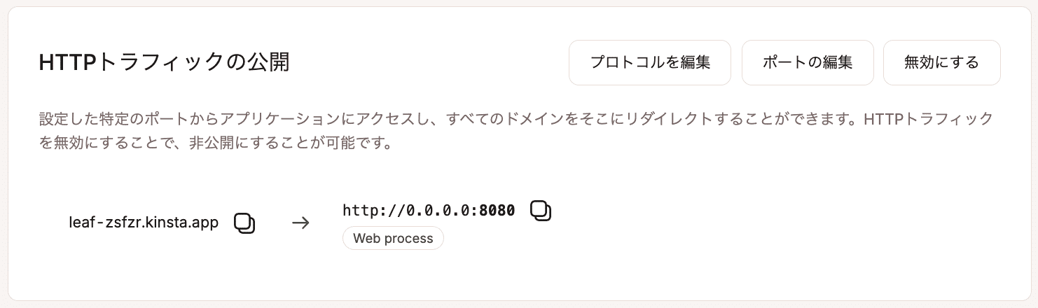 アプリケーションの公開または非公開ポートを設定したり、HTTP(S)トラフィックを無効にしたり、「アプリケーション」>(アプリ名)>「ネットワーク」画面で内部接続を追加したりすることができます。