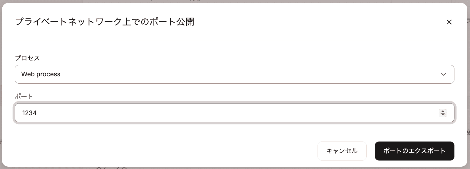 ポートを内部的に公開するには、「ポートのエクスポート」をクリックし、ポートを公開するプロセスを選択してポート番号を入力し、「ポートのエクスポート」をクリックします。