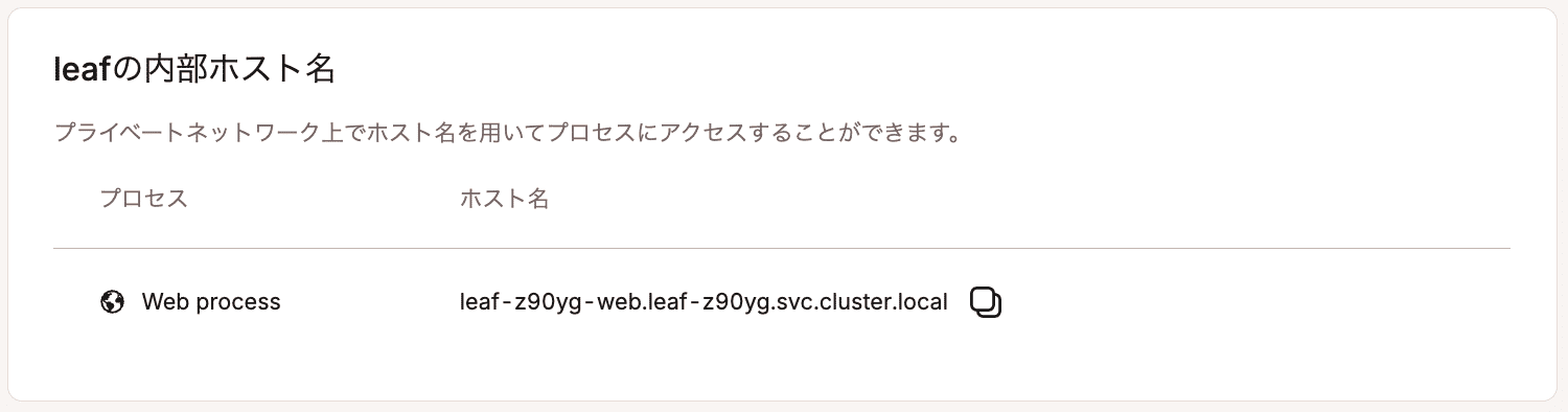 この領域には、すべてのアプリケーションプロセスのホスト名が表示されます。ホスト名を使用して、弊社のプライベートネットワーク上のプロセスに接続することができます。
