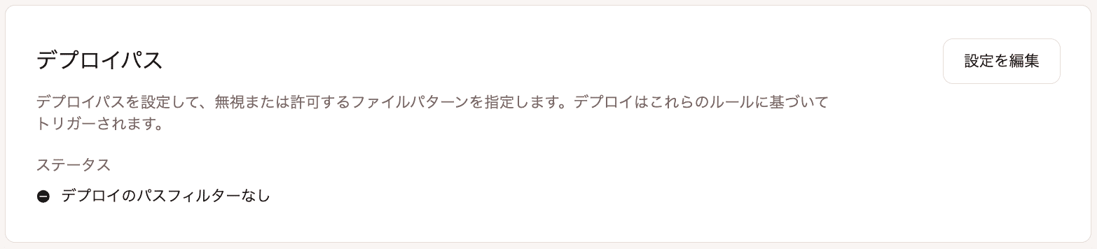 デプロイパスを使用すると、特定のルールセットに基づいてデプロイをトリガーすることができます。デプロイを許可するファイルと除外するファイルを定義可能です。たとえば、/src/backend/**にあるファイルが変更された際にだけデプロイを実行したり、変更が**/*.mdファイルに限定されている場合はデプロイを除外したりすることができます。これは特にモノレポに有用です。
