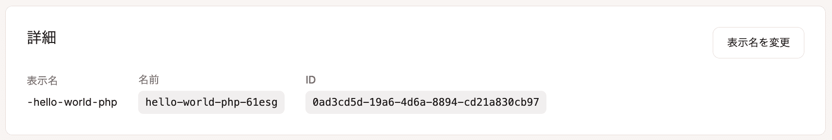 このセクションには、アプリケーションの表示名、名前、IDが表示されます。表示名を変更するには、「表示名を変更」をクリックします。