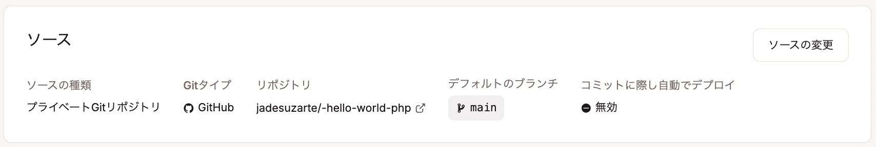 これらの設定を変更するには、「ソースを変更」をクリックします。ブランチを変更する場合は、「デプロイメント」画面からアプリケーションを手動で再デプロイしてください。