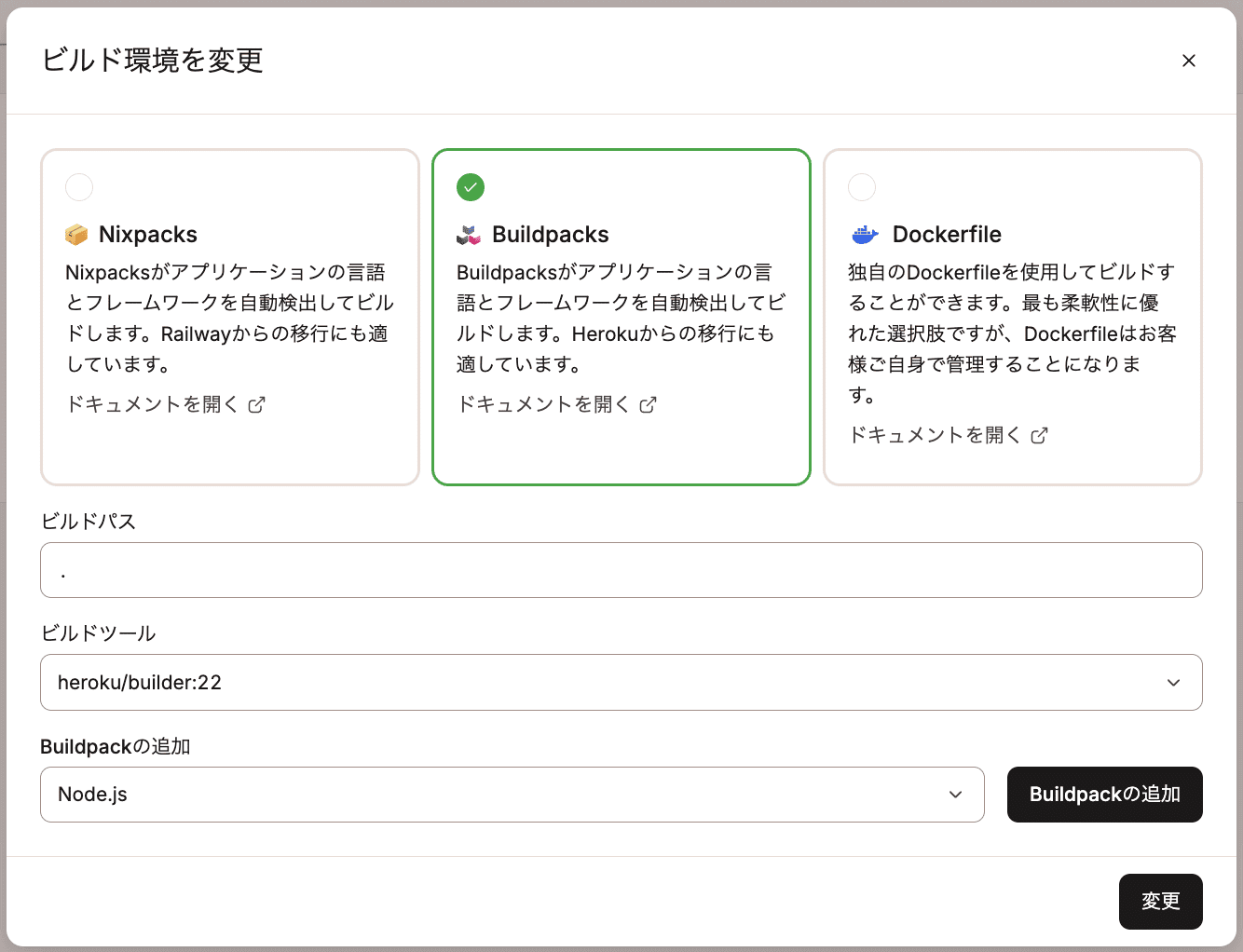 - Buildpackの追加:アプリケーションに必要なBuildpackを追加します。アプリケーションの主要言語を含むBuildpackは、Buildpackリストの最後のものである必要があります。例えば、Node.jsアプリがあり別のBuildpackを追加する場合、Node.jsのBuildpackをリストの最後に配置してください。