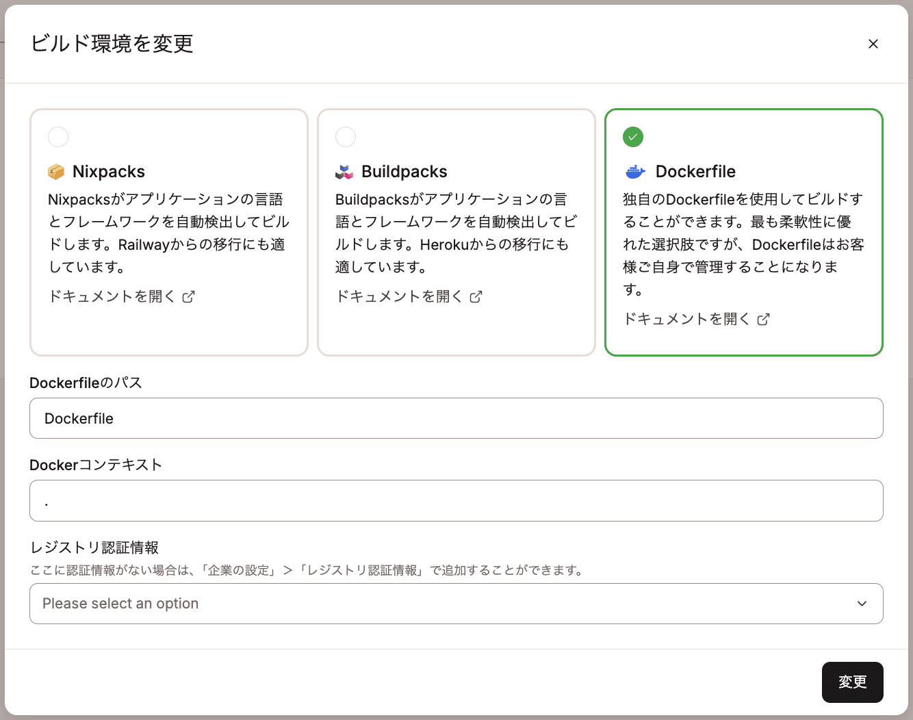- Dockerfileのパス:リポジトリルートからDockerfileへの相対パスです。例えば、Dockerfileがリポジトリルートにある場合は、このフィールドに「Dockerfile」と入力します。Dockerfileが「app」というサブディレクトリにある場合は、Dockerfileへのパスを「app/Dockerfile」のように入力します。