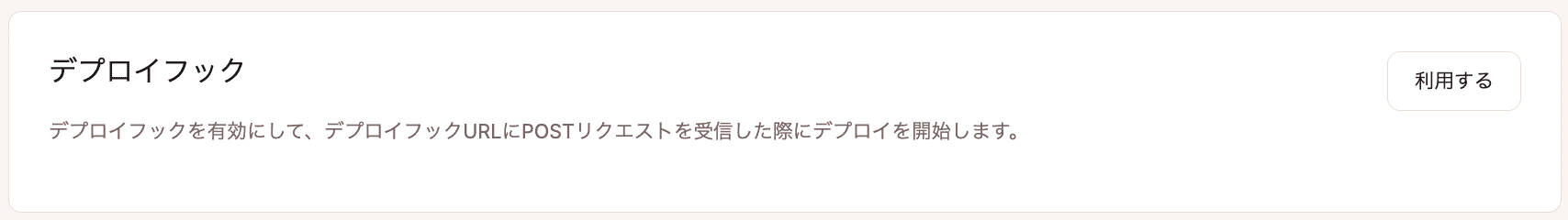 「利用する」をクリックすると、デプロイをトリガーするためにします。POSTリクエストで呼び出す一意のURLが生成されます。外部イベント(リポジトリへのコードのプッシュなど)に基づいてデプロイを自動化するには、リポジトリプロバイダ(GitHub、GitLab、Bitbucket、またはDocker)でWebhookを設定し、デプロイフックURLを呼び出してください。