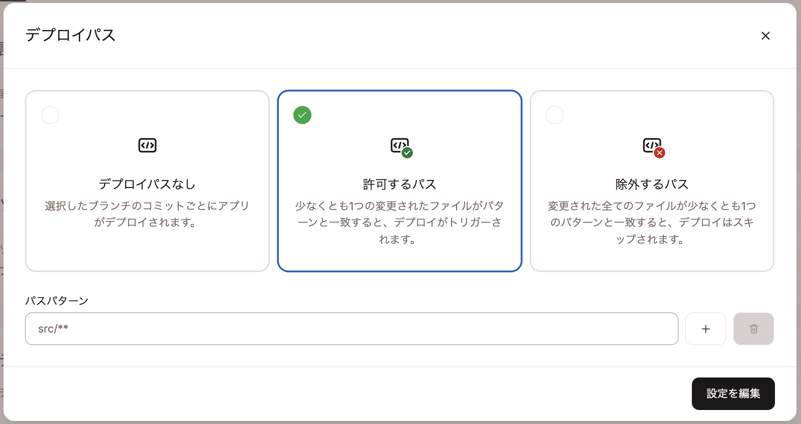 特定のパス内でファイルが変更された際にデプロイを開始するには、「許可するパス」を選択し、特定のパス内でファイルが変更された際にデプロイを除外するには、「除外するパス」を選択します。設定を終えたら、「設定を編集」をクリックします。