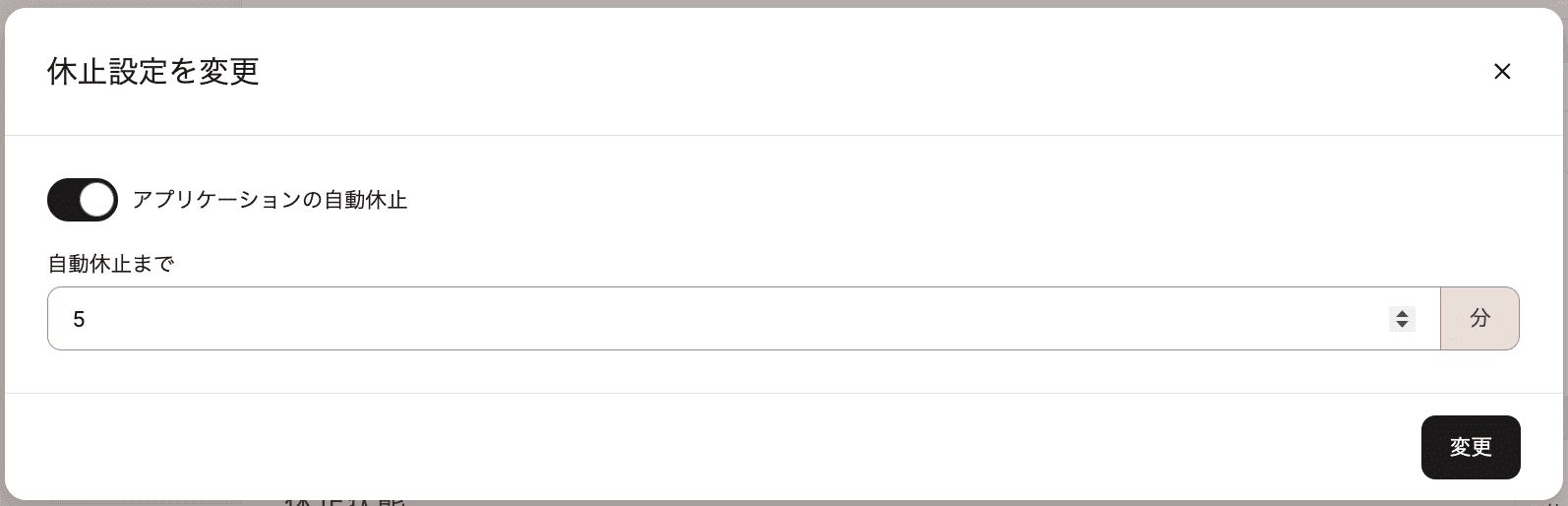 「アプリケーションの自動休止」のトグルスイッチをオンにし、自動休止までの時間を設定して、「変更」をクリックします。