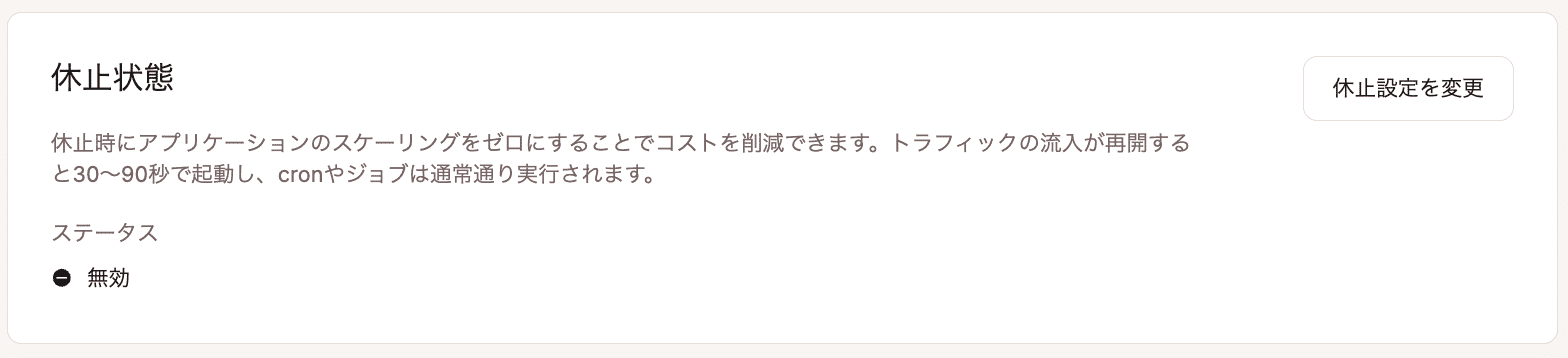 休止状態は、指定した時間枠内にHTTPリクエストが受信されない場合、アプリケーションを自動的にスケールダウンします。トラフィックが再開すると、アプリケーションは 30~90秒後に起動し、その間 HTTPリクエストは保留された状態になります。休止状態が有効になっている間も、cronジョブなどのジョブは通常通りに実行されます。アプリケーションで休止状態を有効にするには、「休止設定を変更」をクリックします。