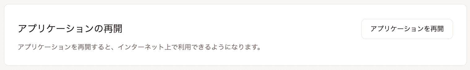 アプリケーションを再開する準備ができたら、「アプリケーションを再開」をクリックし、ポップアップで「アプリケーションを再開」をもう一度クリックして再開を確定します。