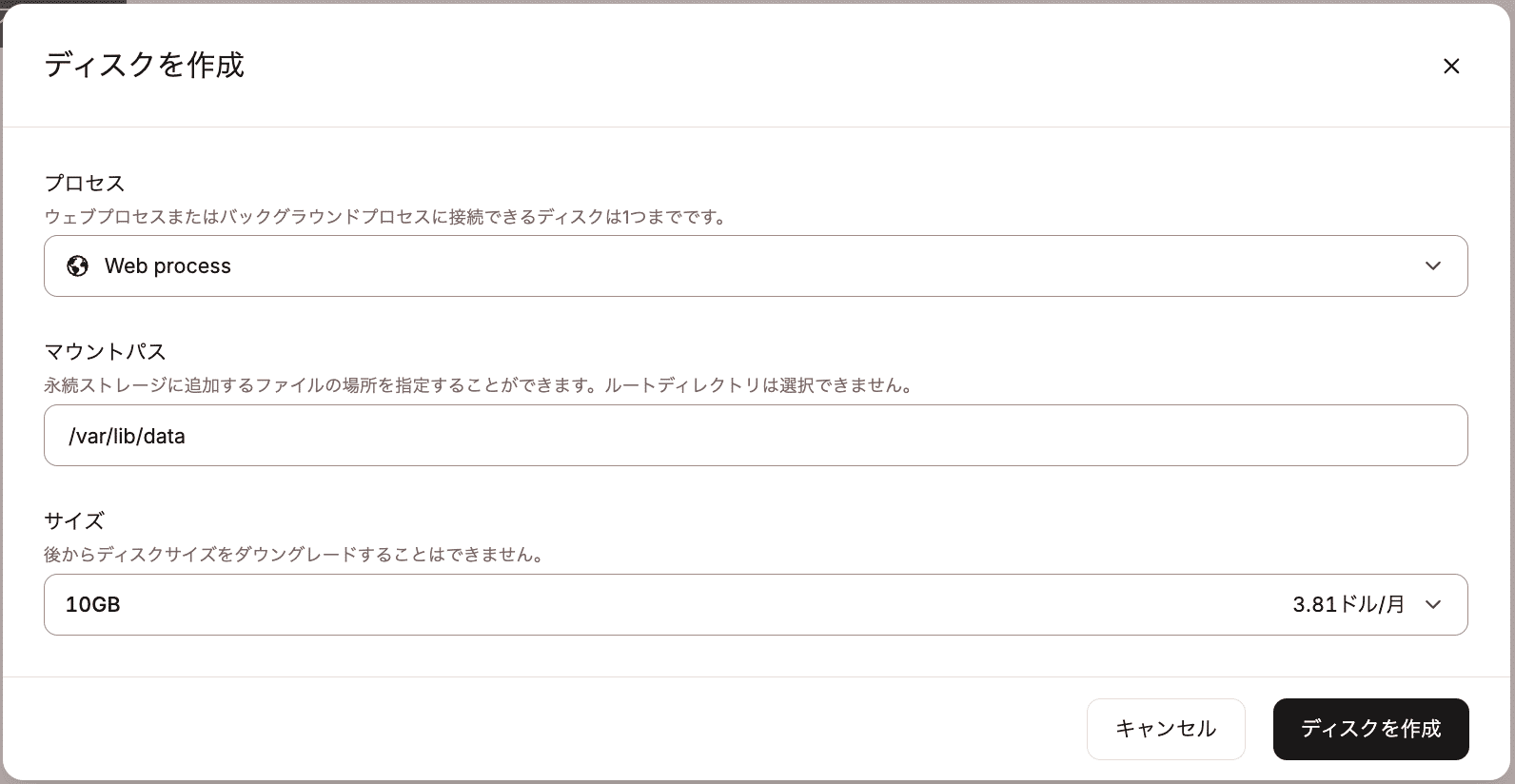 また、アプリケーションを作成した後に、「アプリケーション」>(アプリ名)>「ディスク」画面で「ディスクを作成」をクリックします。ウェブプロセスまたはバックグラウンドワーカーに永続ストレージを追加することもできます。
