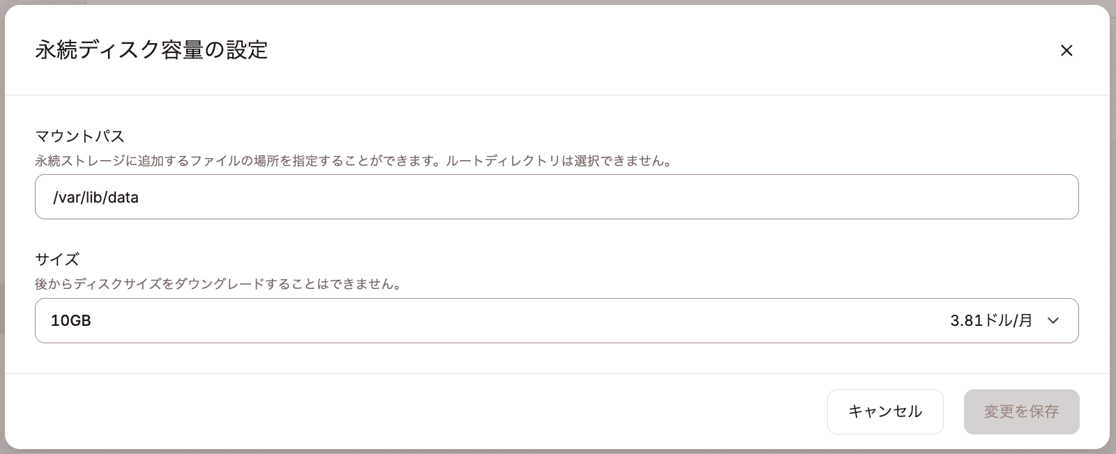 /var/lib/data)。Buildpacks、またはNixpacksを使用してコンテナイメージをセットアップする場合は、ファイルの場所の前に/appを付ける必要があります。例えば、ファイルがwp-content/uploadsに保存されている場合、マウントパスは/app/wp-content/uploadsとなります。注)これはルートディレクトリや構成ファイルのディレクトリにはできません。無効なマウントパスは以下をご覧ください。 - サイズ:永続ストレージボリュームのディスクサイズを選択します。ディスクサイズはアプリケーションの「ディスク」画面で増やすことができますが、一度作成したディスクサイズをダウングレードすることはできませんのでご注意ください。