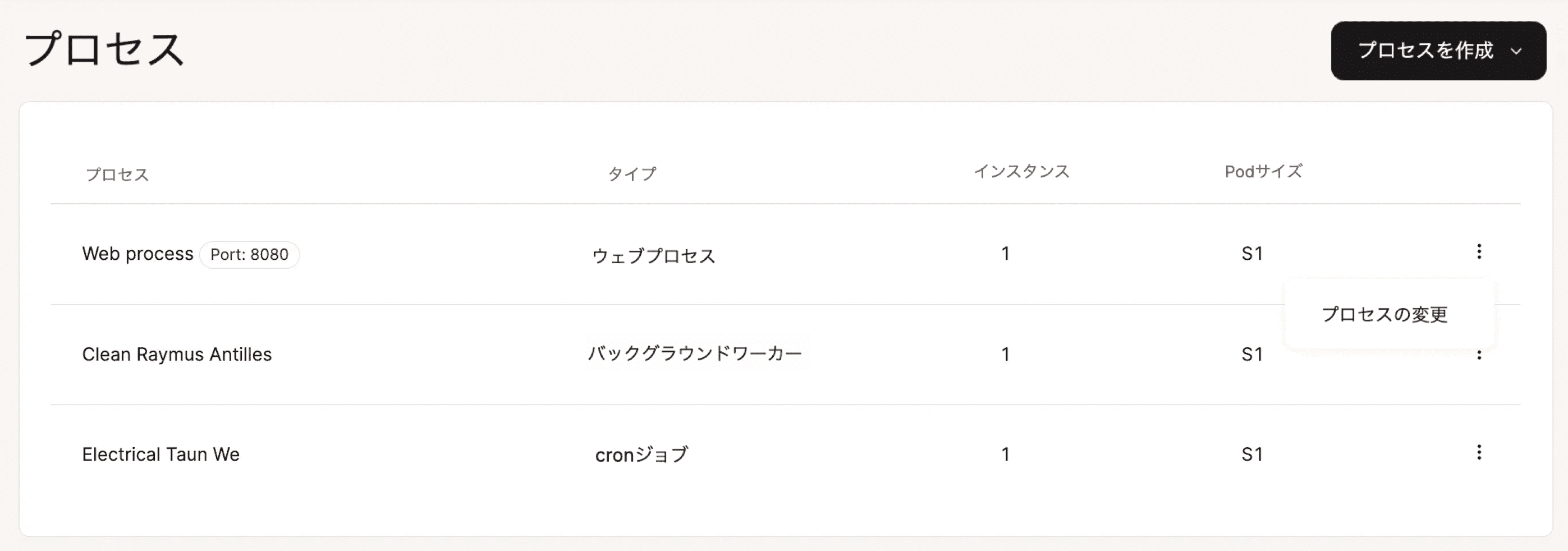 Podサイズを変更するには、MyKinstaにログイン後、「アプリケーション」>(アプリ名)>「プロセス」に移動します。プロセスの横にある3つの点をクリックして、「プロセスの変更」を選択します。