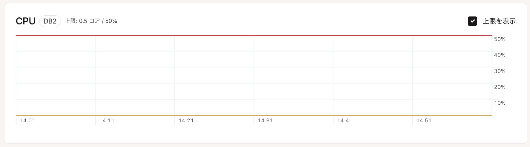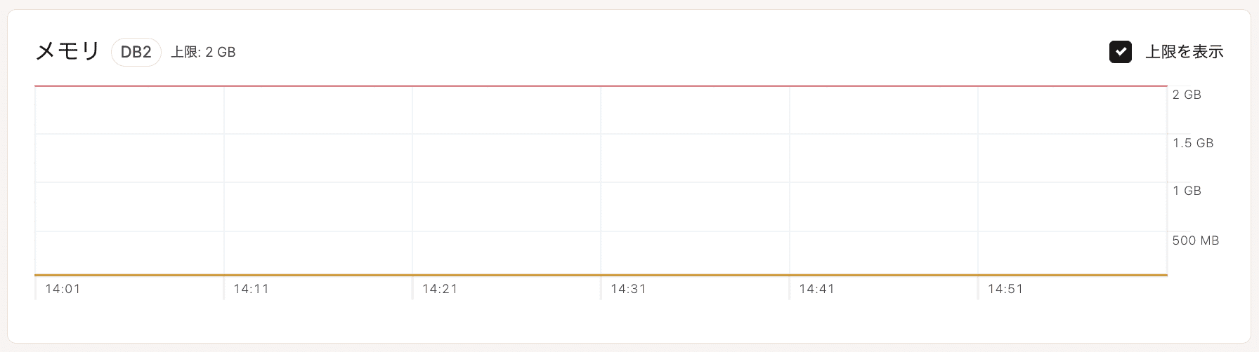 「メモリ」セクションには、選択した期間の総メモリ(RAM)使用量の平均が表示されます。「上限を表示」にチェックを入れると、使用量とリソースの上限を比較することができます。データベースのメモリ使用量が上限に近い、または達している場合は、より大きなデータベースタイプを利用することをおすすめします。データベースの「設定」画面にある「詳細」セクションの「情報を編集」で変更可能です。