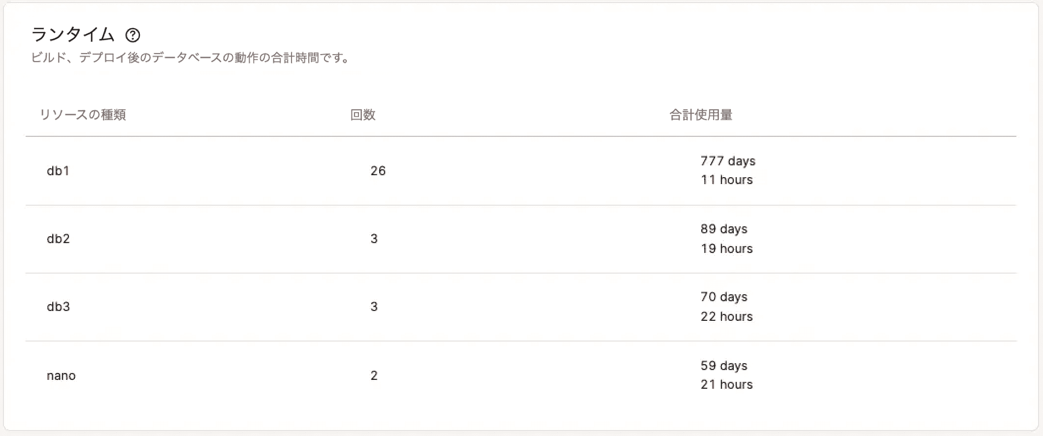 「ランタイム」セクションには、全データベースを対象として、ビルドおよびデプロイ後に実行された合計時間が示されます。リソースの種類と回数は列に分けての表示となります。