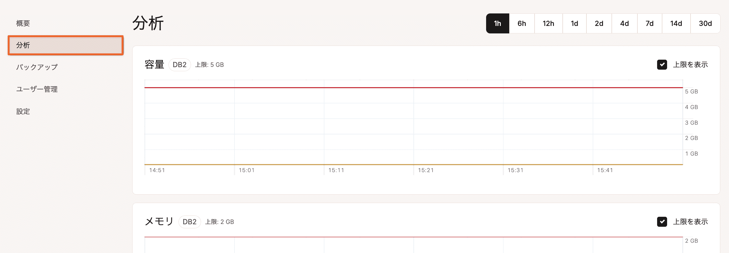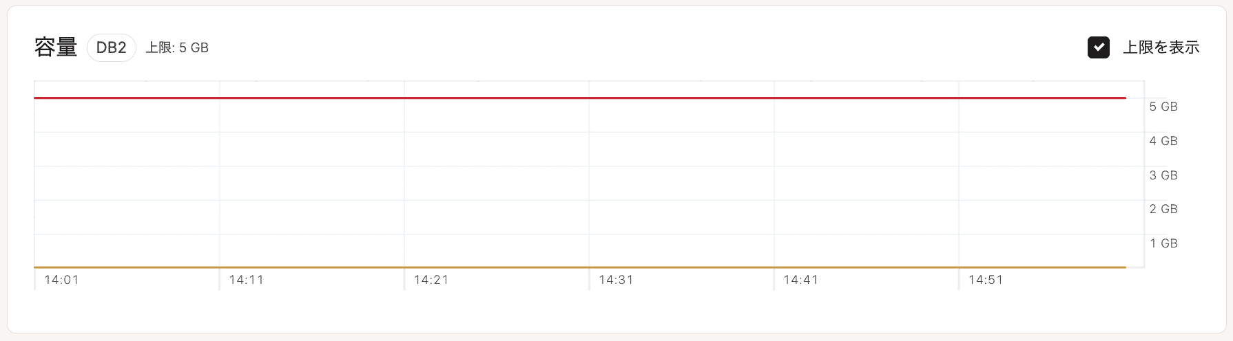 「容量」セクションには、選択した期間のデータベースに保存されたデータ(アドオンで追加した容量を含む)が表示されます。「上限を表示」にチェックを入れると、使用量とリソースの上限を比較することができます。