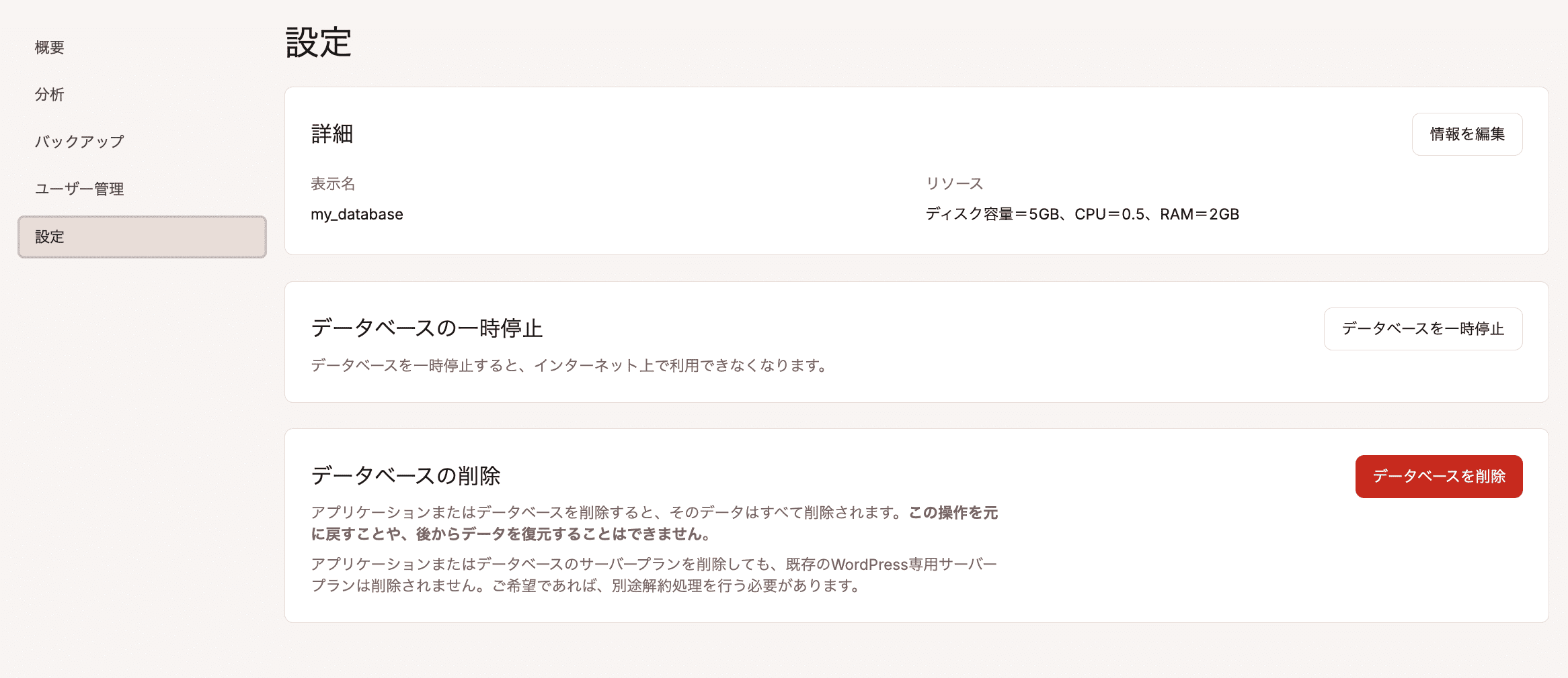 「データベースを削除」をクリックすると、データベースを削除することができます。データベースを削除すると、データベース内のデータはすべて失われます。