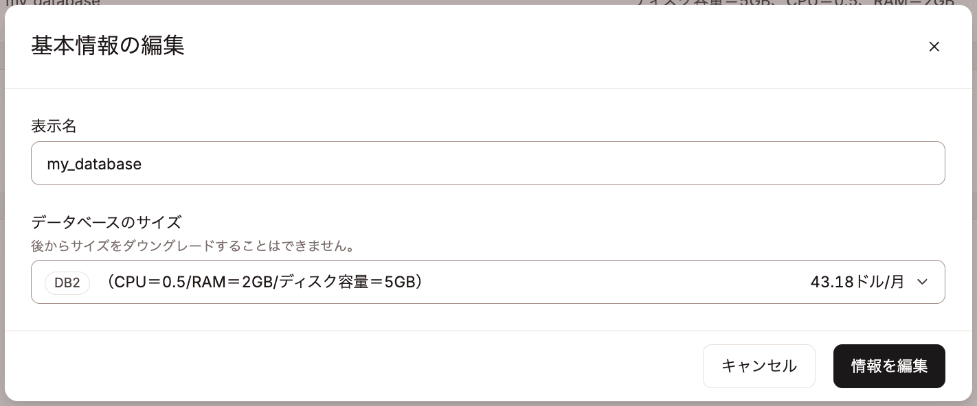 「基本情報」セクションには、表示名と使用可能なリソース(アドオン分含む)が表示されます。データベースの表示名を変更したり、サイズを変更したりするには、「詳細の編集」をクリックして変更を加え、右下の「情報を編集」をクリックします。注)データベースのディスク容量アドオンを使用して容量を増やしている場合は、ディスク容量アドオンを変更する必要があります。