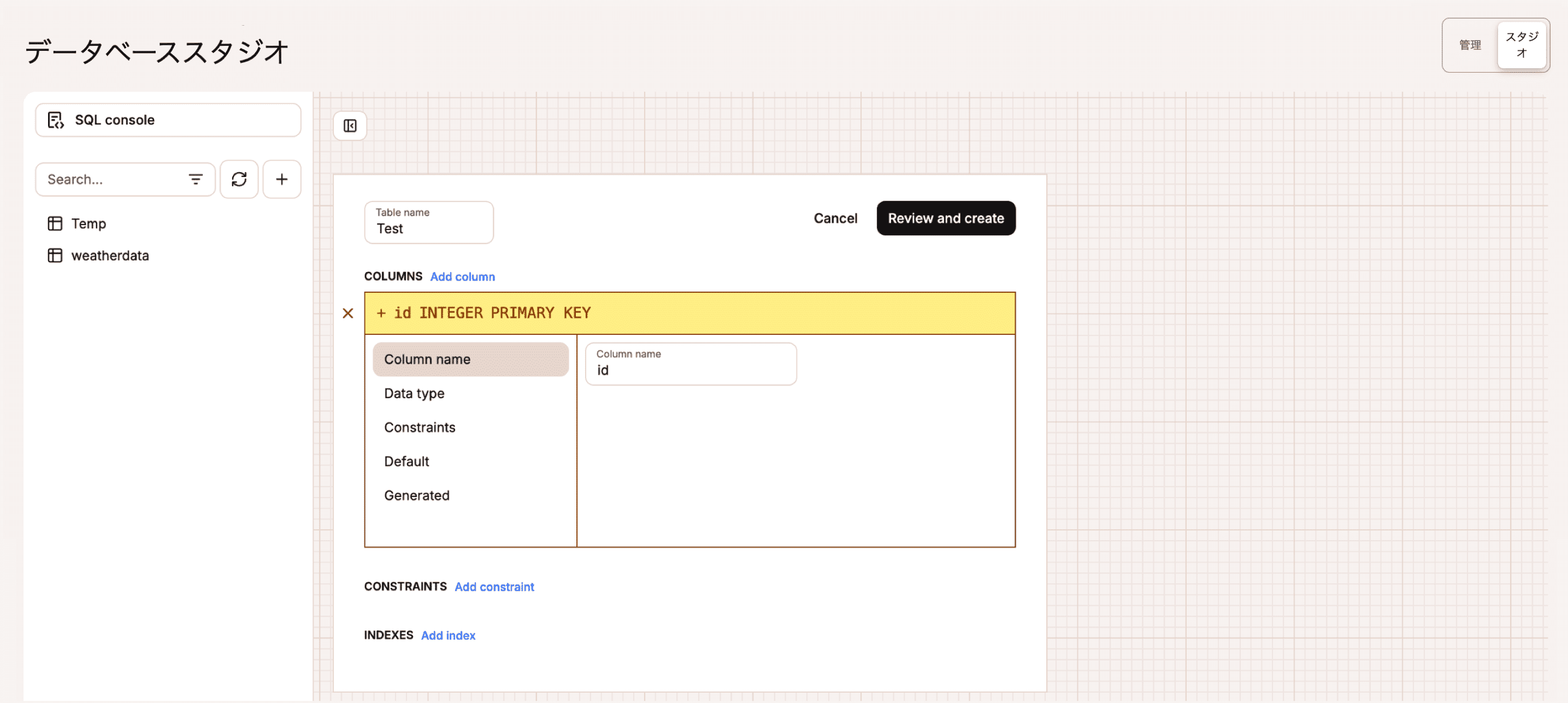 データベースにテーブルを追加するには、「+」を選択し、「Create Table(テーブルを作成)」をクリックします。テーブルに名前を付けて列を定義し、データ型、制約、デフォルト値、および生成されたデータの式を指定します。必要に応じて、テーブルレベルの制約とインデックスを追加することもできます。