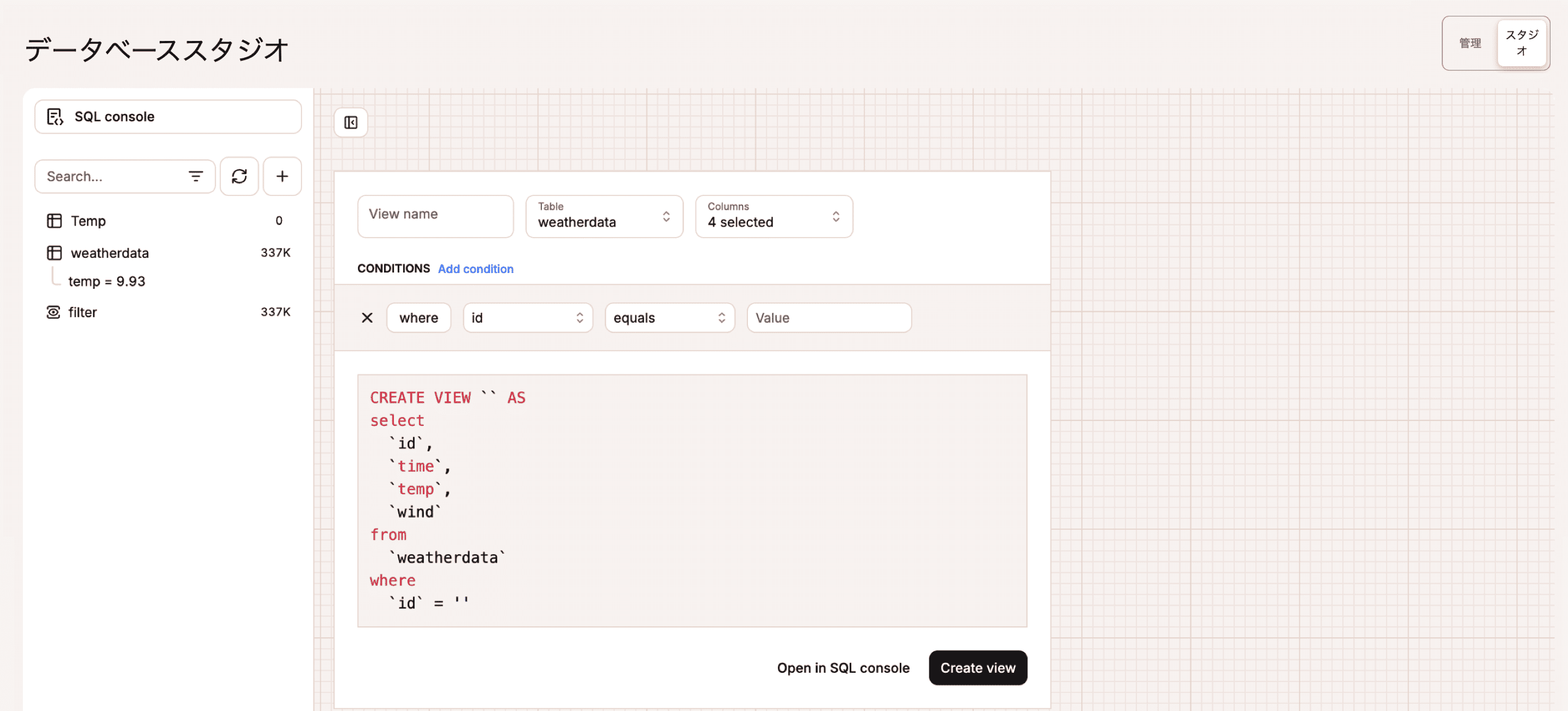 SQL コンソール内でビューを開いて編集するには、「Open in SQL console(SQLコンソールで開く)」をクリックします。