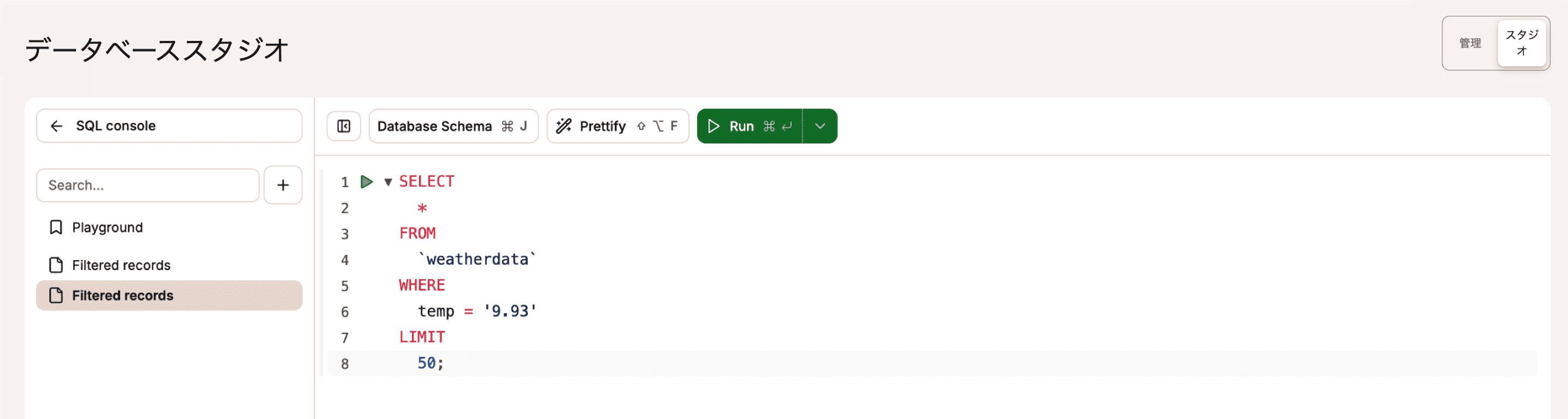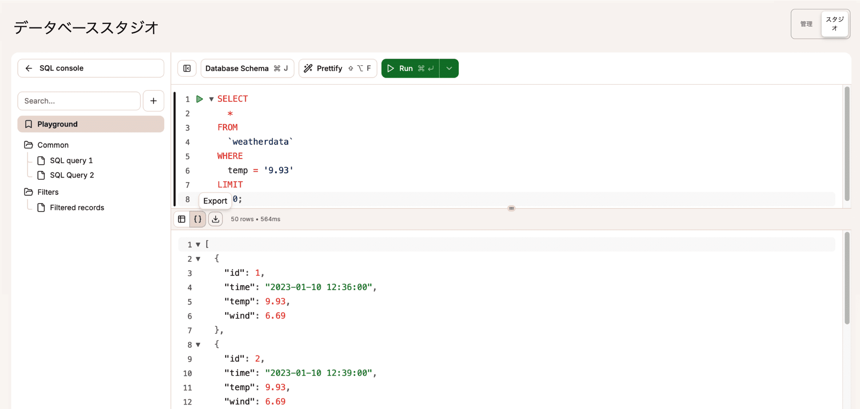 SQLコンソールにアクセスし、データベースに対してSQLクエリを実行することができます。SQLエディターでは、データベーススキーマを表示したり(「Database Schema」)、コードを見やすくしたり(「Prettify」)、直接SQLを実行したり(「Run」)することが可能です。SQLクエリを実行すると、結果をテーブルとして表示するか、JSON として表示するかを選択でき、.json、.csv、.xlsxファイルにエクスポートします。また、これらのクエリをスニペットとして保存し、フォルダを作成してスニペットを整理することも可能です。