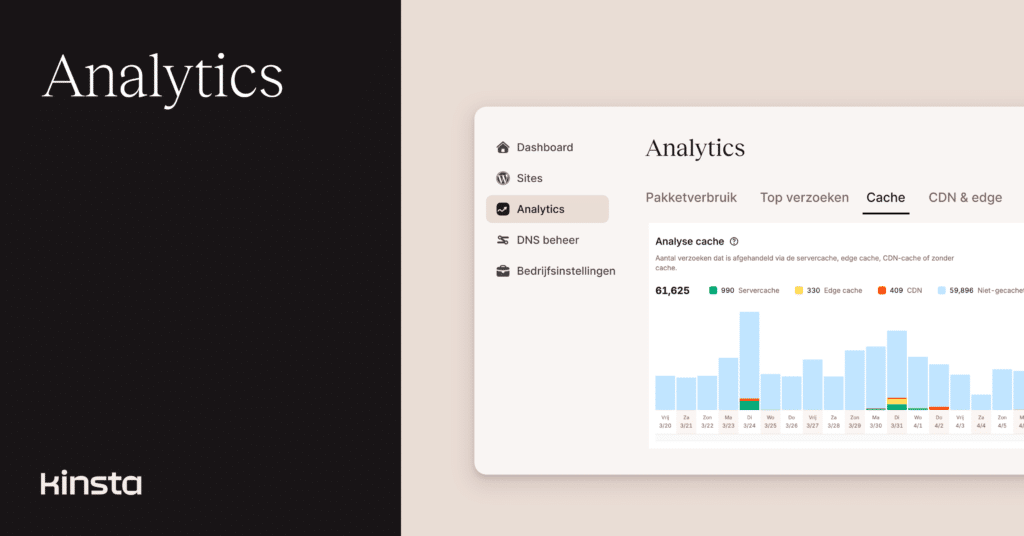 We hebben de rapportage van website analytics in MyKinsta verbeterd, zodat je een duidelijker beeld krijgt van de cacheprestaties – van de server van je site tot aan Kinsta’s Cloudflare-gebaseerde CDN en Edge Cache.