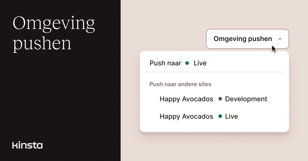 Hierboven is het eerste item in de vervolgkeuzelijst (Push naar live) een omgeving op dezelfde site, ACME Dynamite Co. Onder het label Push naar andere sites staan omgevingen op een tweede site, ACME Anvil Co.