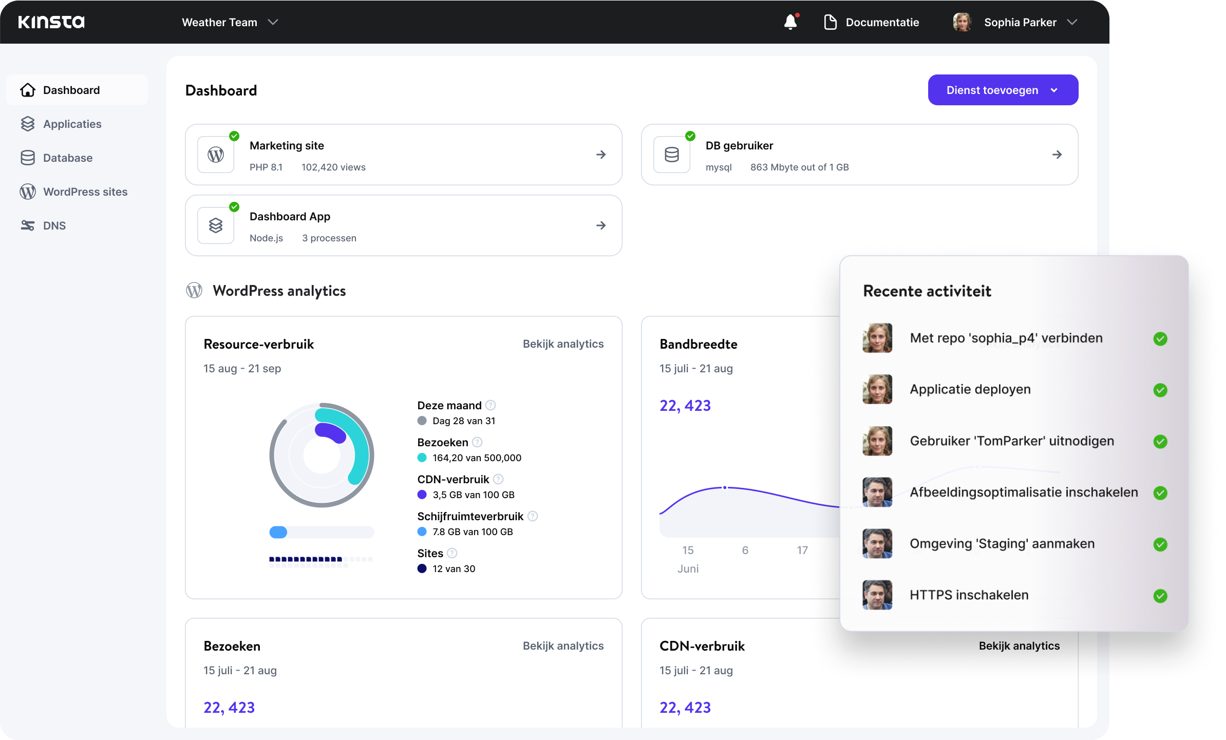 Totaal niet. Het MyKinsta dashboard is gebouwd voor snelheid en eenvoud, met alles van testomgevingen tot analyse in een moderne, intuïtieve interface.