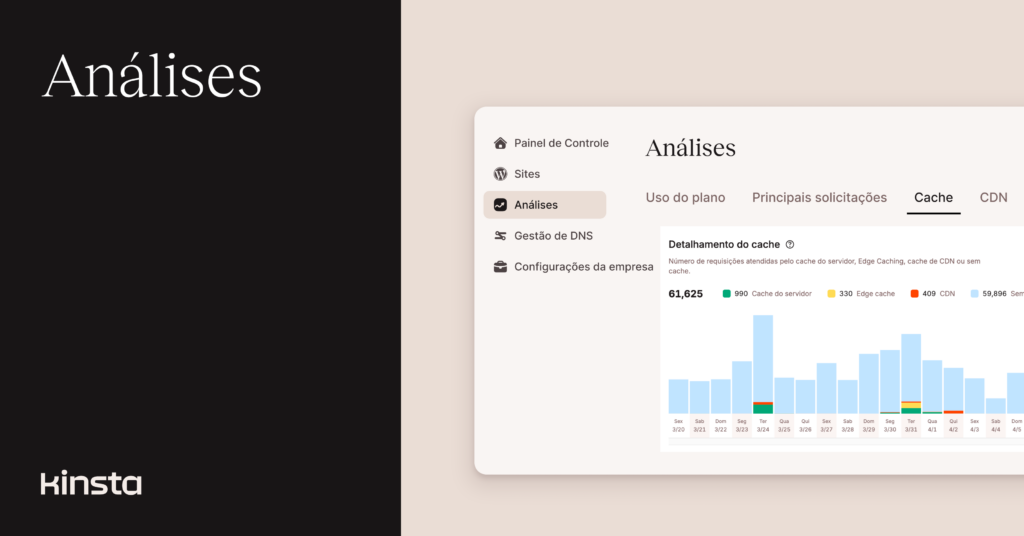 Atualizamos os relatórios de análises no MyKinsta para oferecer uma forma mais clara de visualizar o desempenho de cache, desde o servidor do seu site até o CDN baseada no Cloudflare da Kinsta e o Edge Caching.