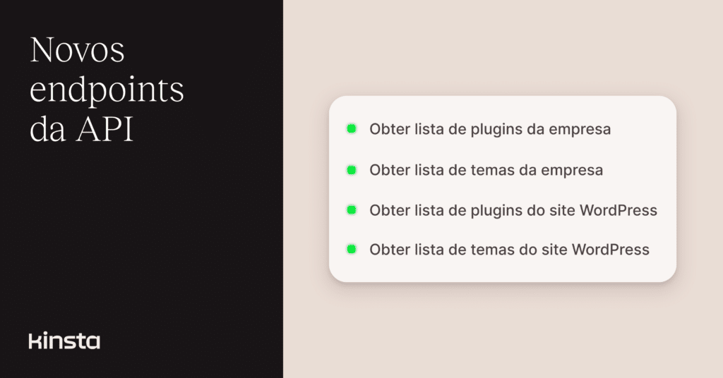 Com essas adições, a API da Kinsta agora oferece uma visibilidade mais clara sobre plugins e temas, tanto em nível da empresa quanto em nível do site.