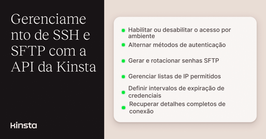 Agora, estamos expandindo essas mesmas capacidades para a API da Kinsta, aprimorando nossos endpoints existentes de gerenciamento de usuários SFTP para oferecer controle programático total sobre o acesso SSH e SFTP.